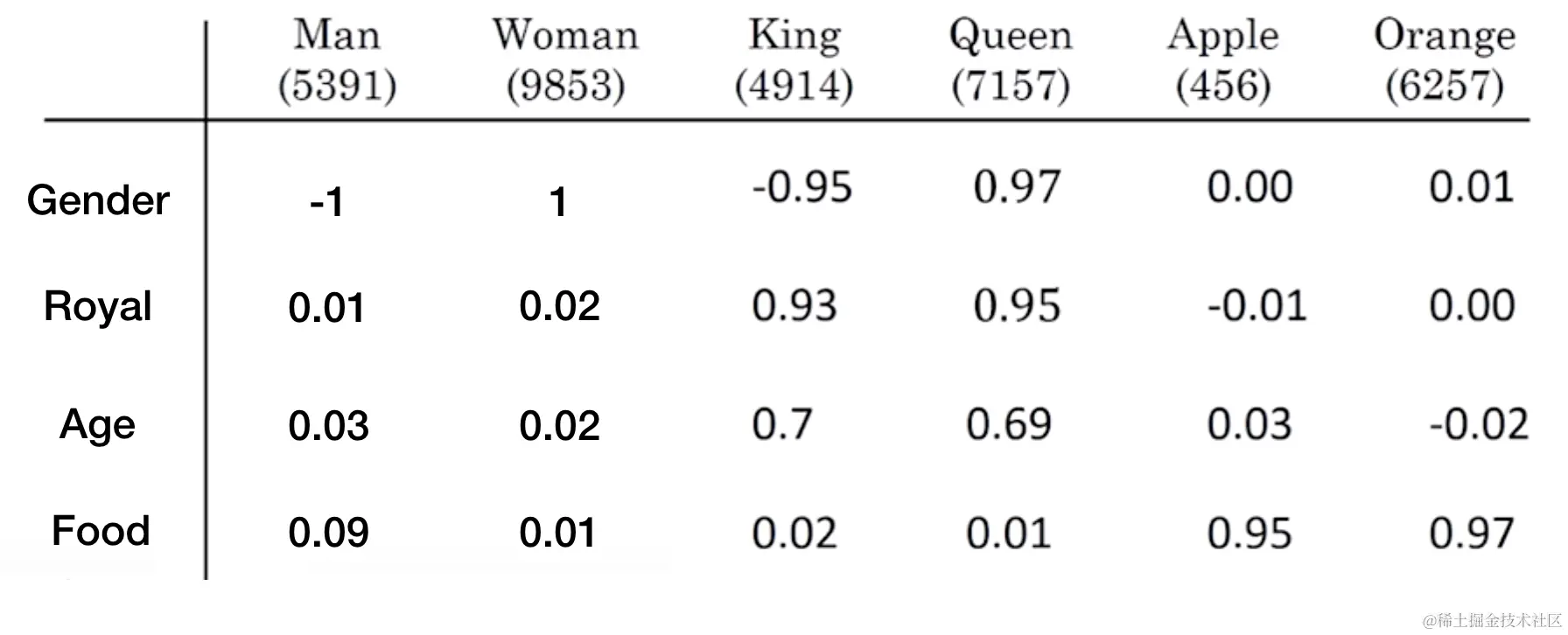 例如Apple与Orange会更近一些,Man与Woman会近一些,取任意两个向量计算内积都为0