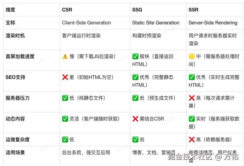 核心策略:静态内容 SSG 预渲染,动态内容 CSG 客户端渲染,平衡体验与开发成本。