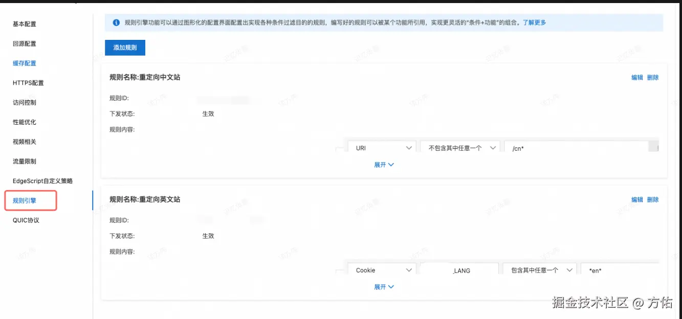 CDN提供了两种方式来配置规则,第一种是规则脚本,第二种是规则引擎,脚本可以自行编写代码,但需要按照CDN规定的语法来写,比较麻烦,适合比较复杂的匹配逻辑,而规则引擎是CLI配置界面,适合规则明确,相对简单的配置