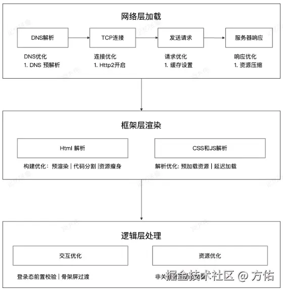 项目是从0到1的过程,起初的性能指标并没有,更多是从输入url到DOM展现,思考哪一些是我们可以去优化的,整个优化过程可以抽象成三个部分,网络层加载优化,框架层渲染优化,逻辑层处理优化