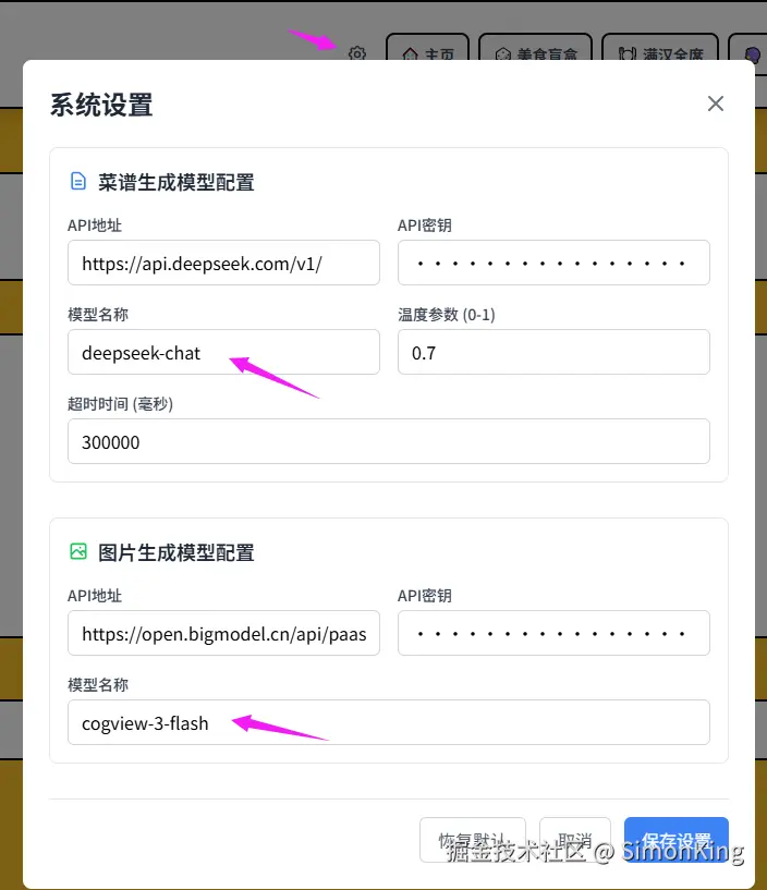我们可以看到菜谱默认使用的是deepseek-chat,而文生图使用的是cogview-3-flash。可以在这里配置适合自己的大模型。作者也是做到了可配置化。