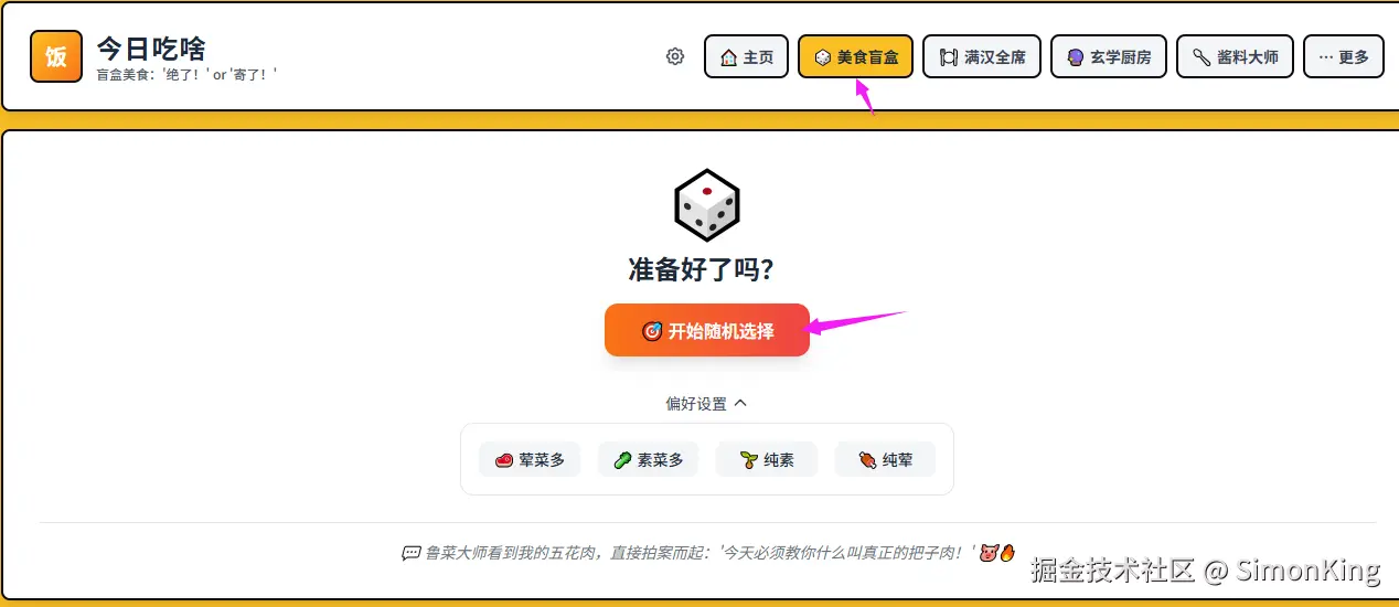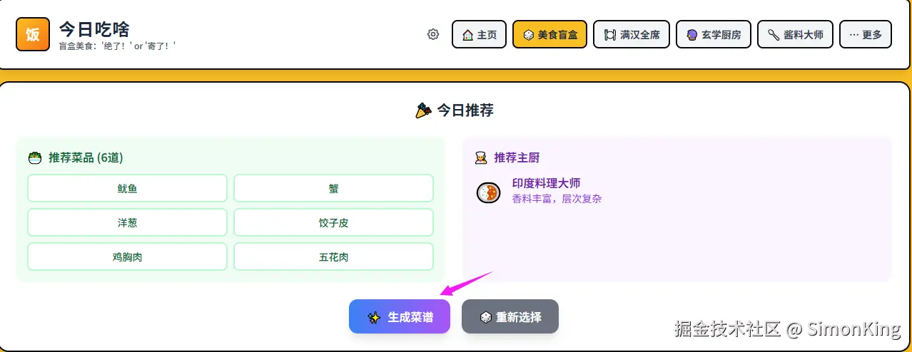 在首页,我们分别可以看到主页、美食盲盒、满汉全席、玄学厨房、酱料大师,以及更多。