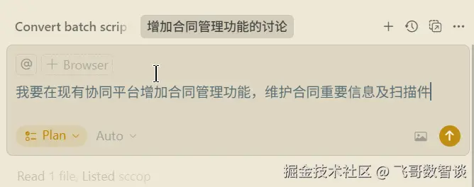 Agent输入框中切换为“Plan”模式开始规划。 - 就你的需求回答澄清问题,以获得最佳输出质量。