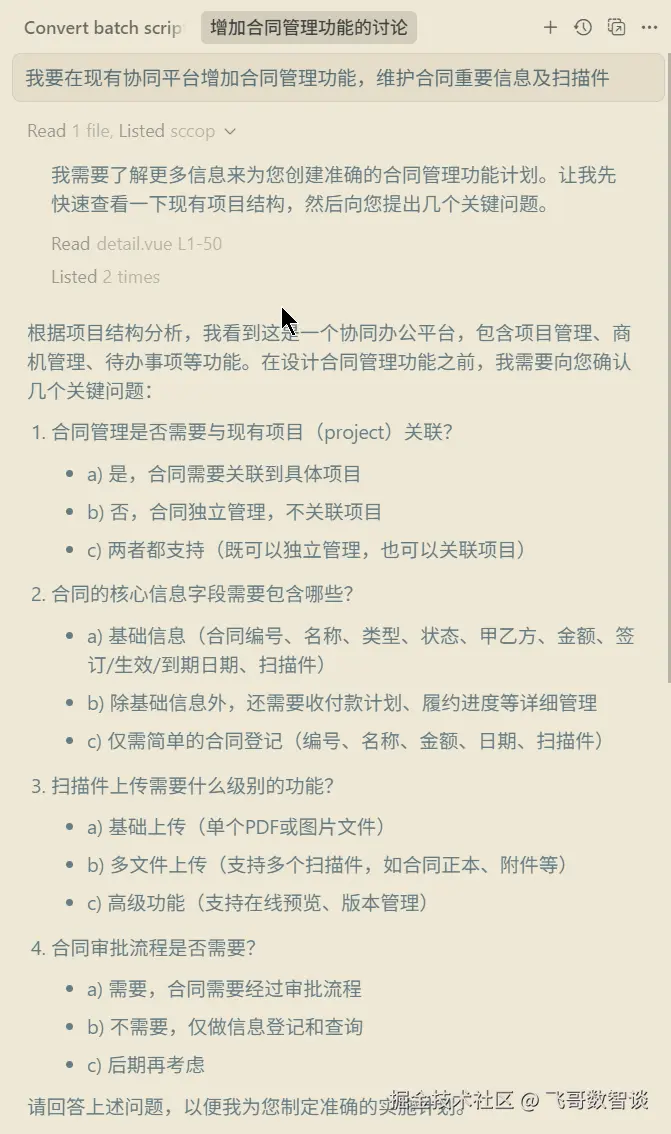 步骤2:发送指令,收到澄清问题。这一步有点惊艳,不是简单的复述,而是像真实的需求对齐。