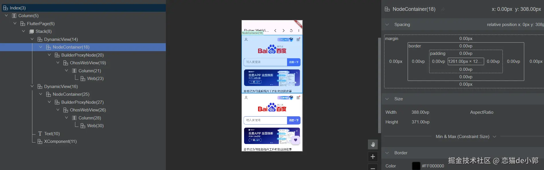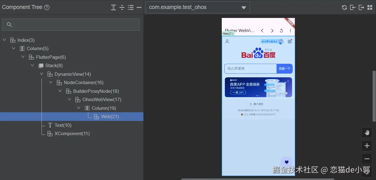所以,当 DVModel 作为状态发生变化时,和它相关的 DynamicView 也会发生变化,这也是 Flutter 鸿蒙在 PlatformView 实现上的特殊之处 ,比如在鸿蒙 Flutter 里运行 webview_flutter 之后,在 ArkUI Inspector 可以看到以下的布局: