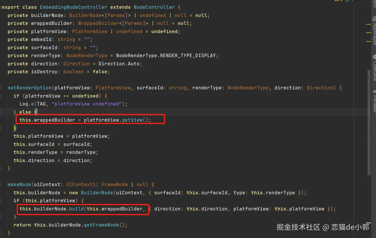 而这对应到 Flutter 鸿蒙实现里,就是 EmbeddingNodeController 的实现,它通过继承 NodeContainer 并实现 makeNode创建和管理 ArkUI 的 BuilderNode ,而 BuilderNode 里的 wrappedBuilder 则是来自封装好的 PlatoformView 里的 ArkUI 的 @Builder 实现: