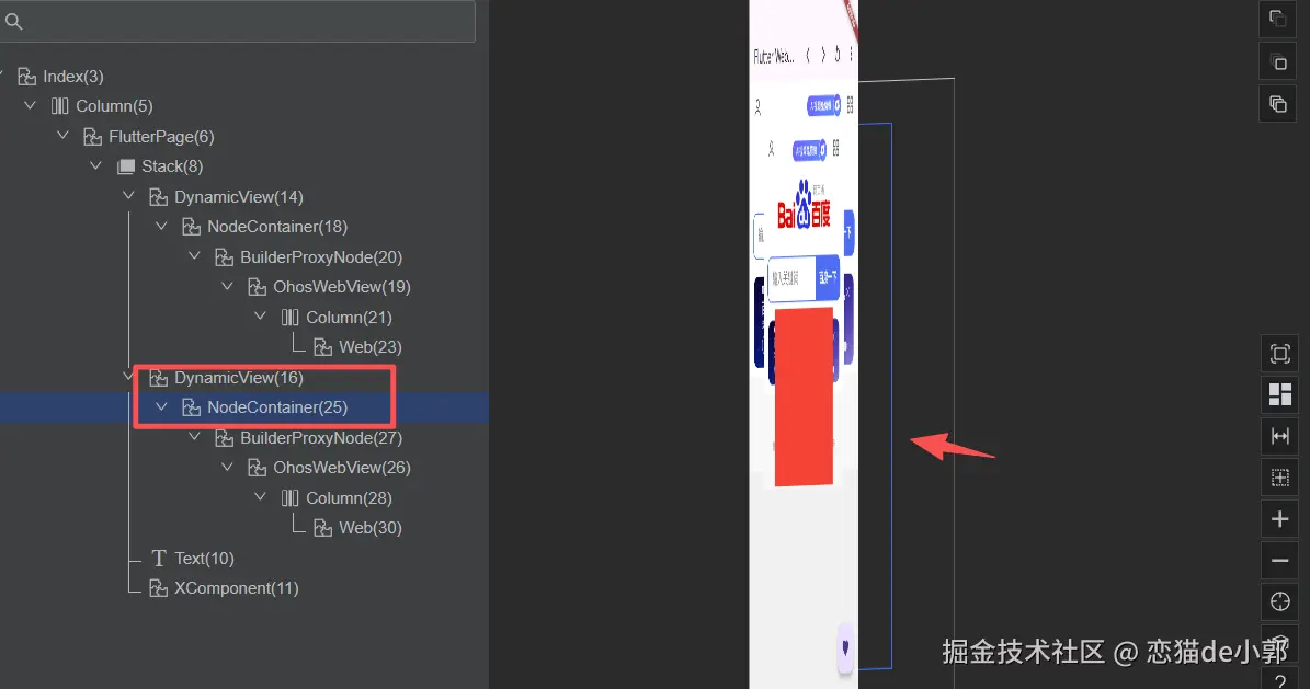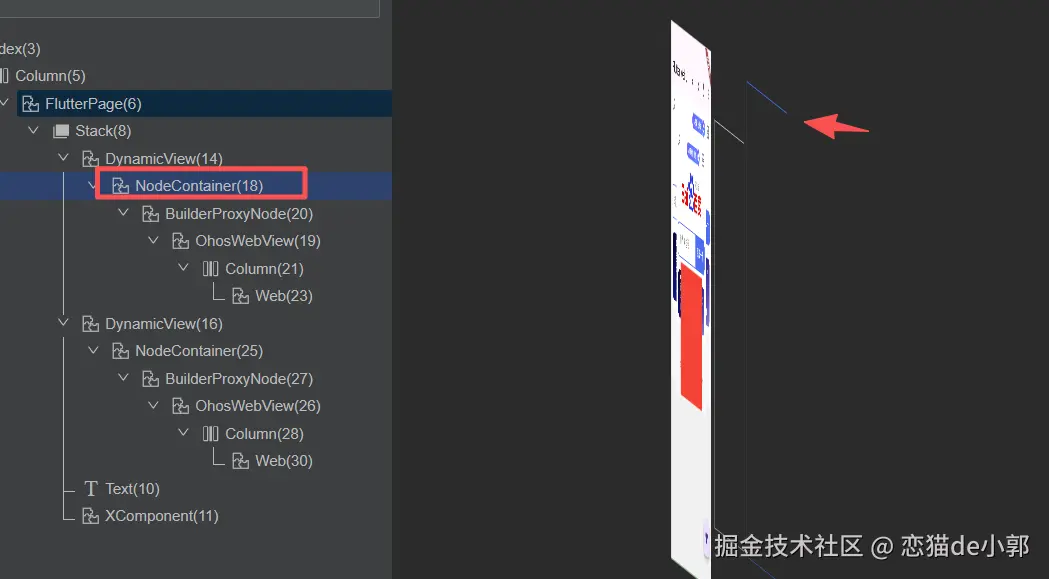 如果我们堆叠两个 Web ,并且在 Web 上在加一个 Flutter 红色控件,通过 ArkUI Inspector 我们可以看到对应 DynamicView 的 NodeContainer 存在的节点,只是该节点的内容并没有渲染在原来的位置: