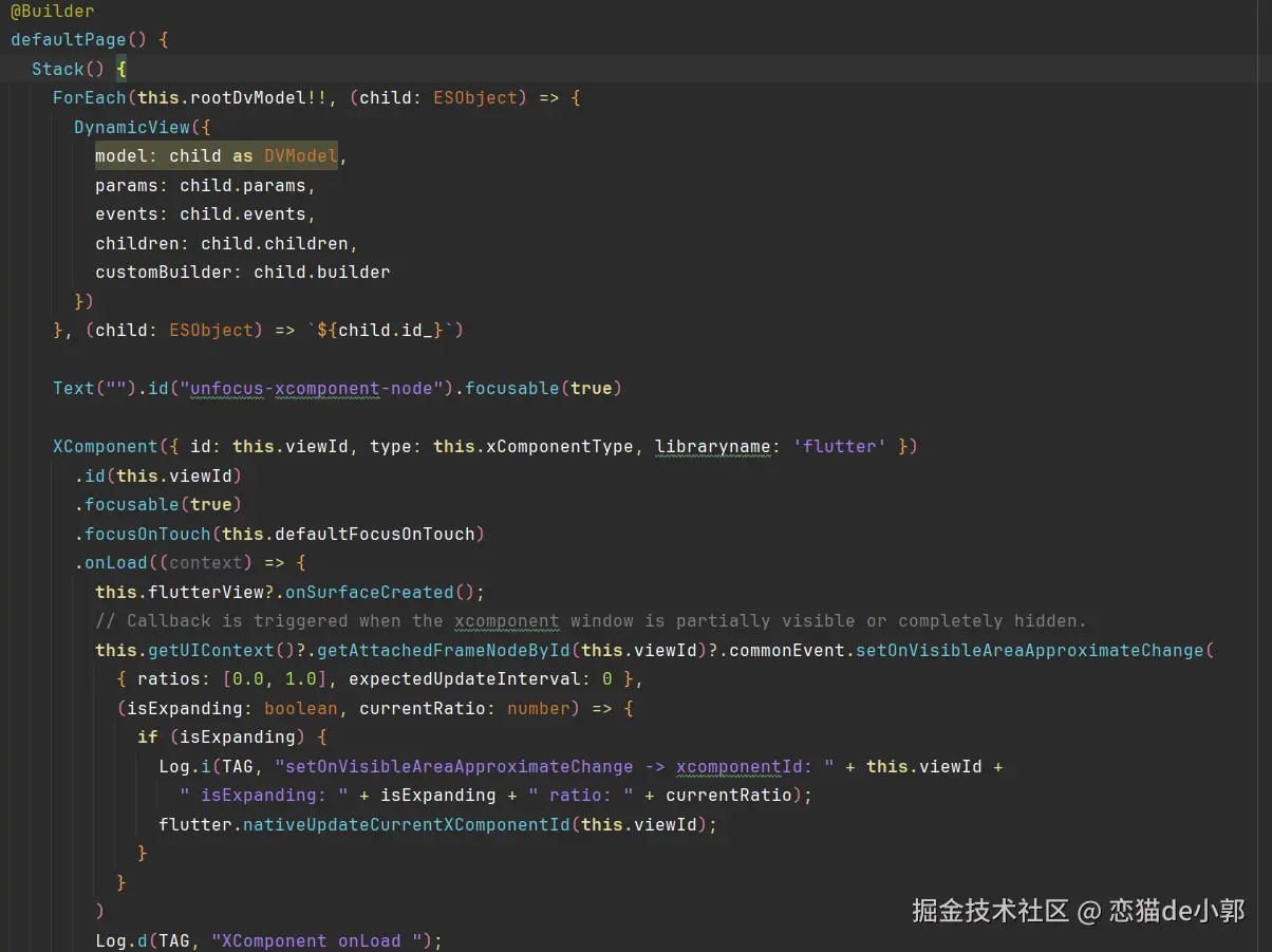 而另一方, EmbeddingNodeController 作为 NodeController 的具体实现,它肯定是用于管理 NodeContainer ,而 Flutter 鸿蒙里,用于创建和加载 NodeContainer 的对象则是 DynamicView ,它是一个基于 DVModel 数据驱动的对象,我们可以在 FlutterPage 的默认实现里看到它的身影: