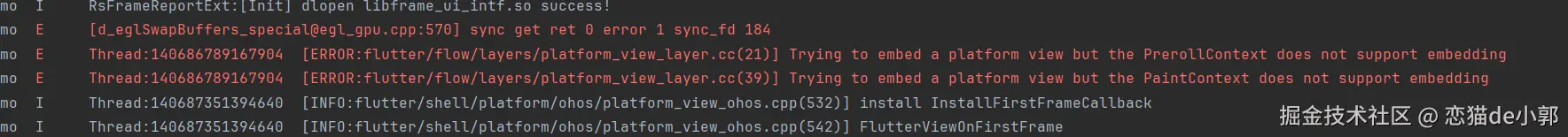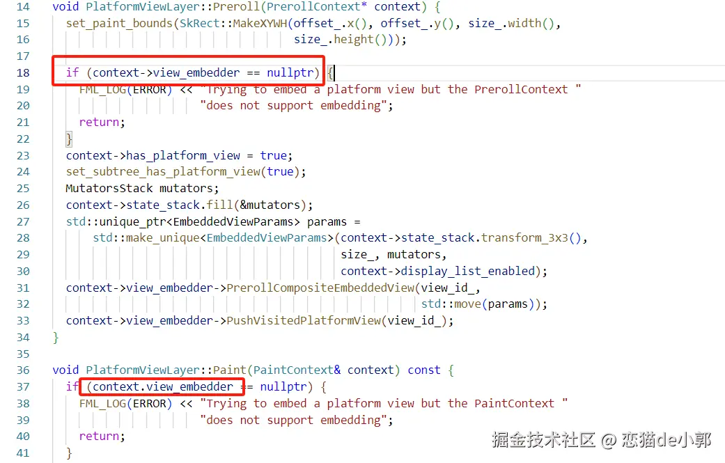此时虽然和 Android 一样存在两个入口,可以根据 Dart 层是否配置了 hybrid 来决定使用 createForPlatformViewLayer 还是 createForTextureLayer ,但是实际上目前只有 createForTextureLayer 一种可用,如果配置了 hybrid 模式,运行后就会发现此时会出现 view_embedder 为空的情况: