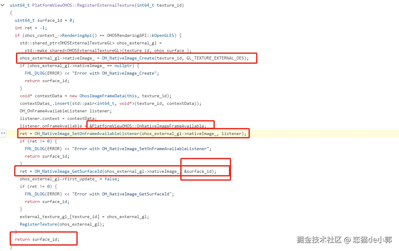 这里需要说个题外话,获取 surface id 时,其实是在 Engine 底层,利用系统 Graphic2D 的 NativeImage 能力,通过 OH_NativeImage_Create 创建一个 OH_NativeImage 实例: