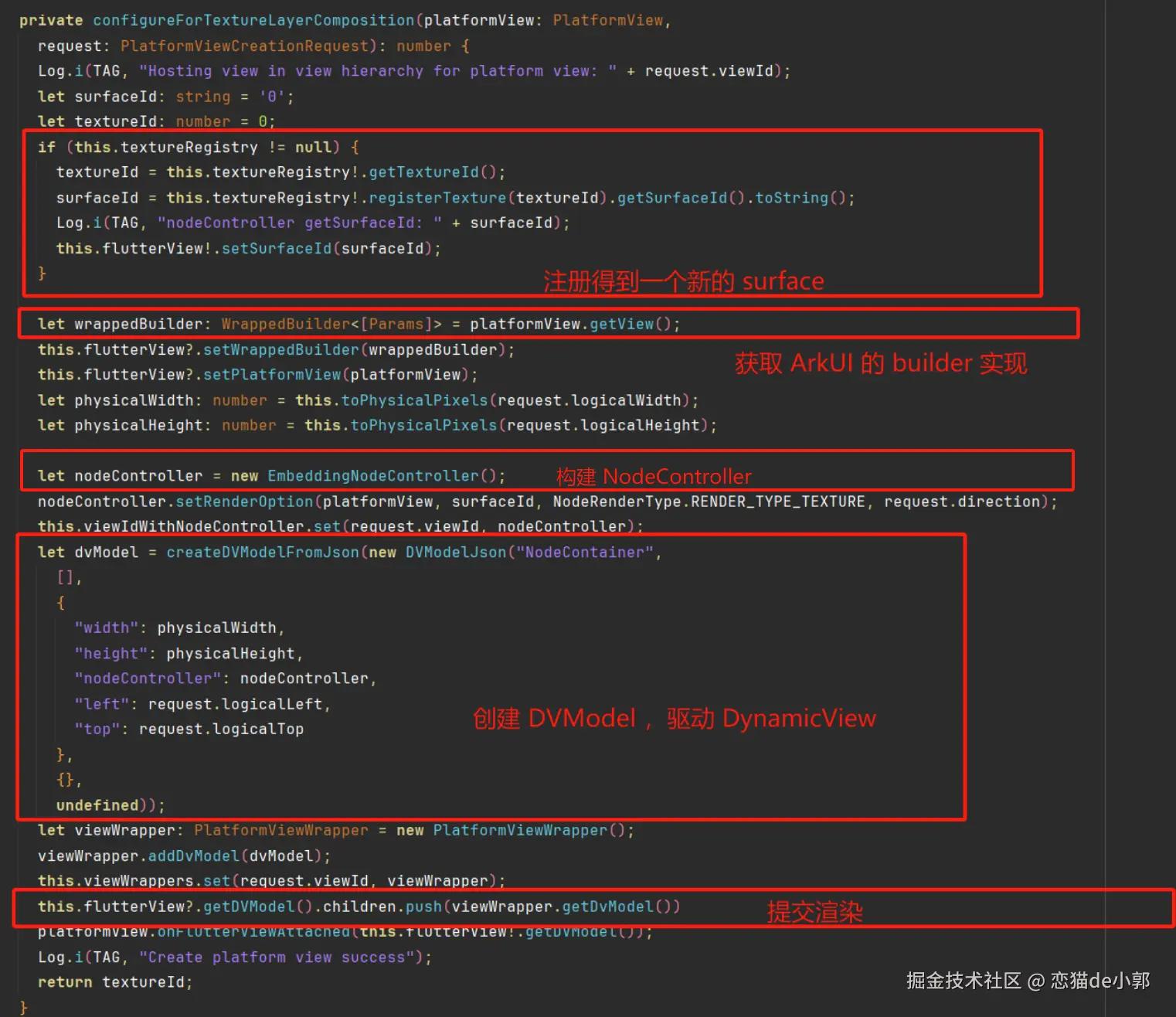 上述就是 TextureLayer 的大致注册和渲染流程,回到主流程上,最后流程在得到 DVModel 后, DynamicView 会构建出来 NodeContainer ,从而触发 EmbeddingNodeController 的 makeNode ,进而 BuilderNode 构建并提取 PlatformView 里的 ArkUI 控件纹理,最终渲染出画面。