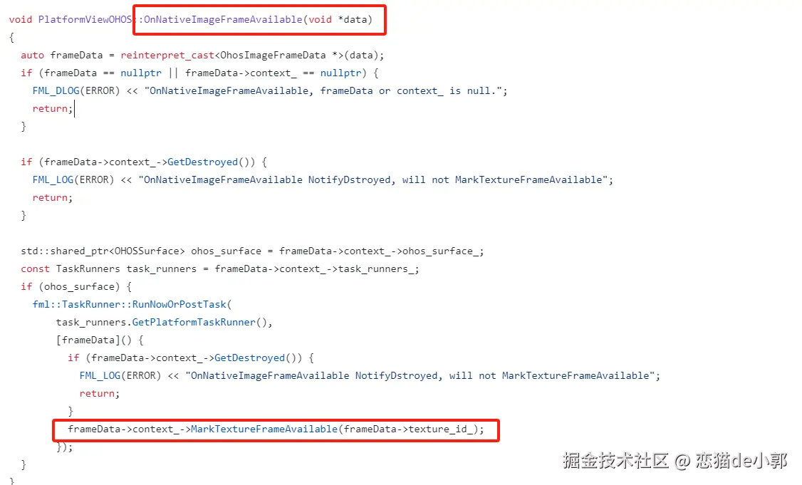 注意 OH_NativeImage_SetOnFrameAvailableListener ,会在 Frame 数据可用时触发 MarkTextureFrameAvailable ,实际上它类似于 C++ 层面在纹理对象上设置一个内部标志,本质上是将其标记为“脏”或“过时”,类似 setState 的作用:
