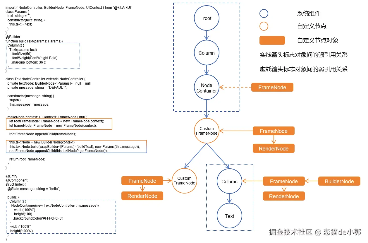 而 FrameNode 作为特殊 Component 节点,它提供了节点创建和删除的能力,也就是在 ArkUI 这种声明式开发场景里,提供了命令式操作的支持,另外 FrameNode 还提供了 getRenderNode 接口,用于获取 FrameNode 中的 RenderNode ,也就是通过 FrameNode 可以直接提供绘制的渲染节点,简单来说: