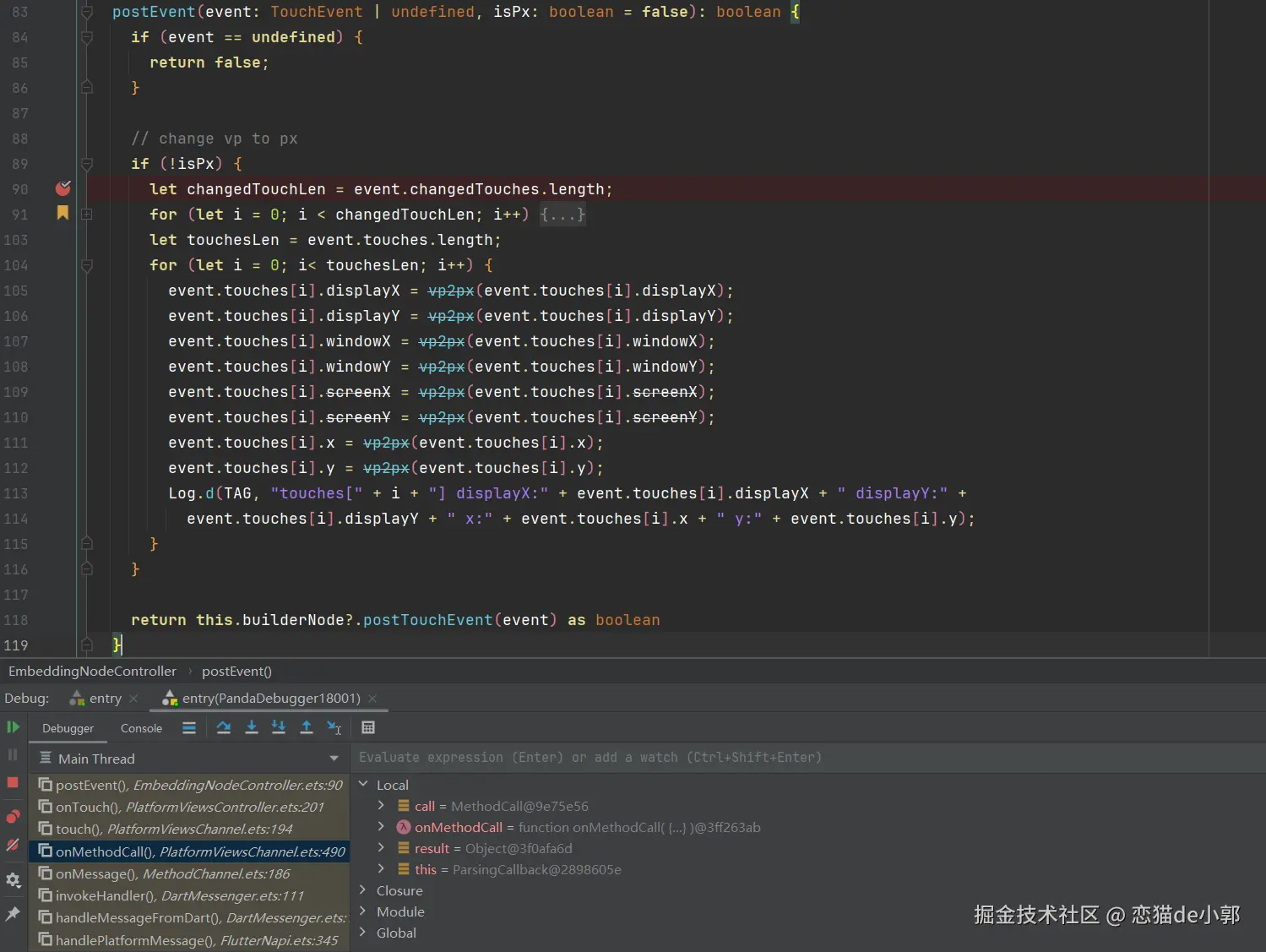 而因为此时 Web 组件是通过纹理的方式被渲染到 Flutter Engine 里,所以在事件触摸上,触摸事件需要从 Dart 层发送出来,经过中转,最后通过 EmbeddingNodeController 的 postEvent 转发到 BuilderNode ,从这点看,也是和 Flutter Android 的 VD 模式类似: