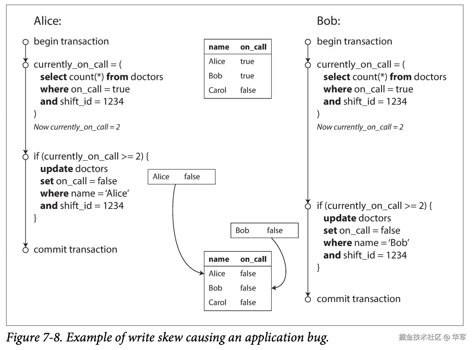 看这医生值班的例子,值班医生可以请假,但要保证每个排班都要有一个值班医生。Alice和Bob两个人不巧此时都感觉不舒服,在他们都去查询1234班次的时候,数据库返回on call的医生都有两个,于是他们都去请假了。最后结果是违反了业务的约束。