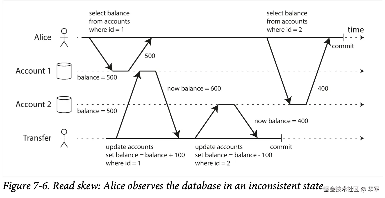 这个叫Read Skew或者不可重复读。我个人感觉Skew理解成偏离、偏见更好,我们对一个人或一个事情从不同角度、不同时代看,会有不同的看法,即会产生偏见。此处的Read Skew就是指在时间维度上的偏离,Alice在转帐前看到的数据就是一个时间维度上的偏离,如果在转账后她就能看到最新的数据了。