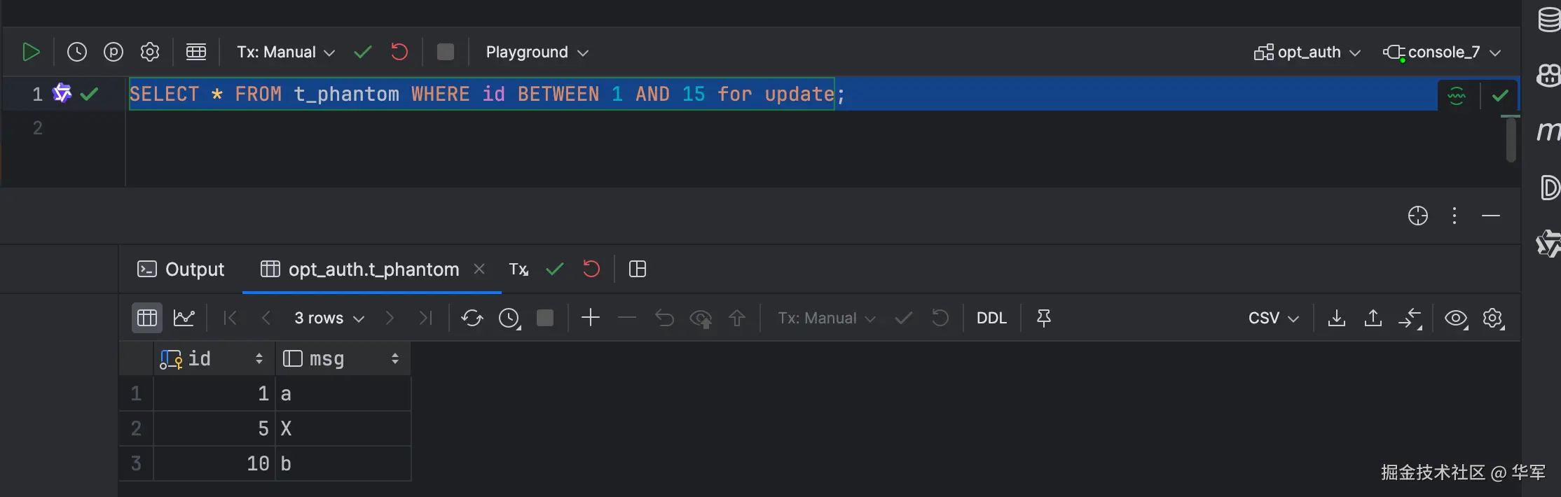 INSERT INTO t_phantom VALUES (1,'a'),(10,'b'),(20,'c');