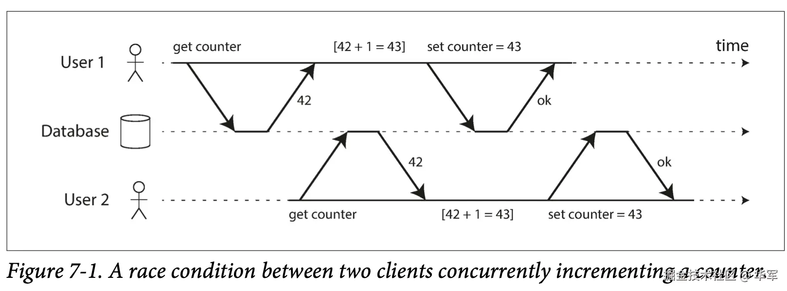 前面的并发问题除了脏写外,说的都是只读事务在遇到并发写的情况会出现脏读、Read Skew等现象。如果当前事务同时包含读写,还会出现哪些并发问题呢?更新丢失是一个,典型的像上图的计数器,最终结果是43,丢失了User1先操作的一次更新。归纳起来,就是后一个写操作覆盖了前一个写操作。