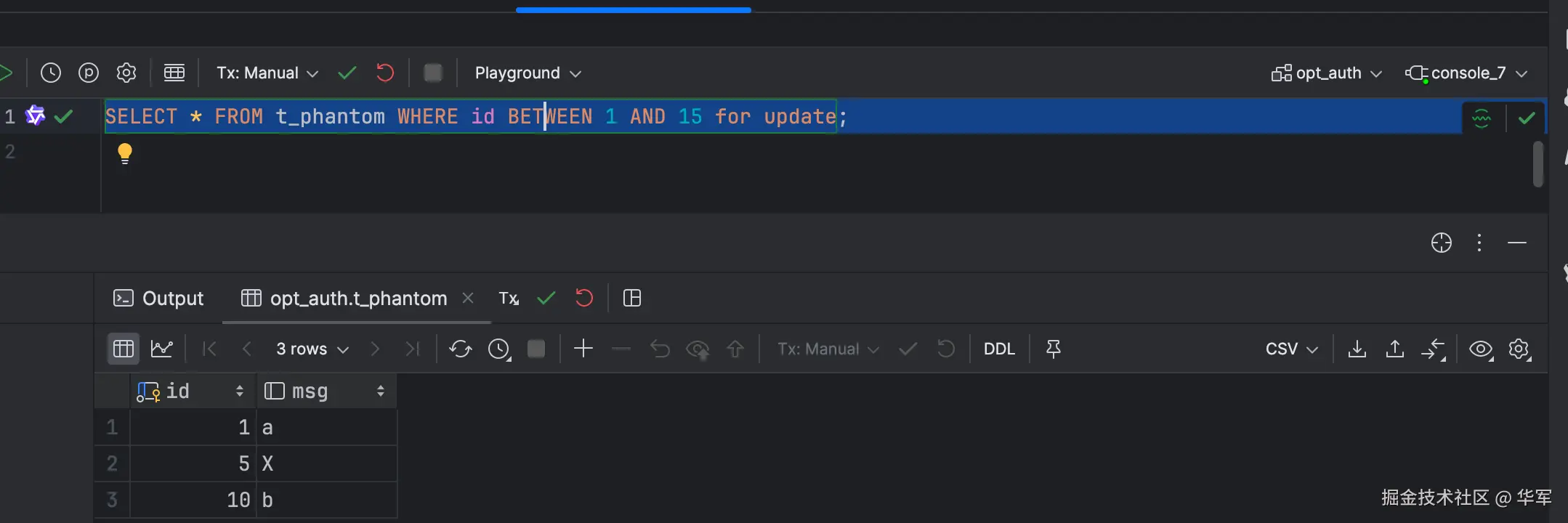 - 显示锁对于其它几个例子就没有办法了。因为预定会议室、创建用户、移动玩家,它们第一步的查询条件可能不返回任何数据或者一部分数据,但是在第三步具体写的时候查询条件返回的结果不一样,有数据了,这就导致我们无法提前进行加锁。