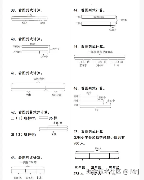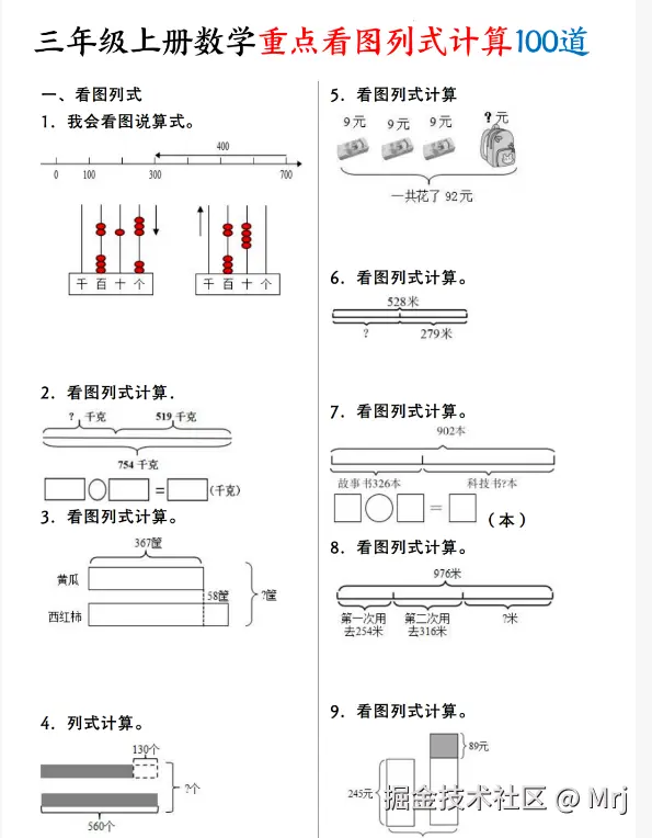 三年级上册数学《看图列式计算》专项练习题,有答案共100道,电子版可下载可打印,通过这份三上数学重点看图列式计算练习题,帮助孩子锻炼观察能力和思维能力,提升孩子的数学计算水平。需要的家长,抓紧领取上给孩子们练一练吧!