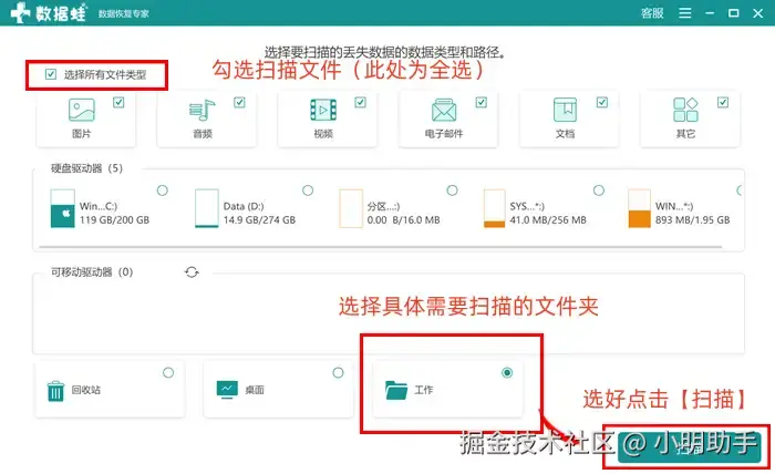 步骤1: 打开软件进入首页,在提示的协助下完成文件类型选择和扫描位置选择,单击【扫描】按钮;