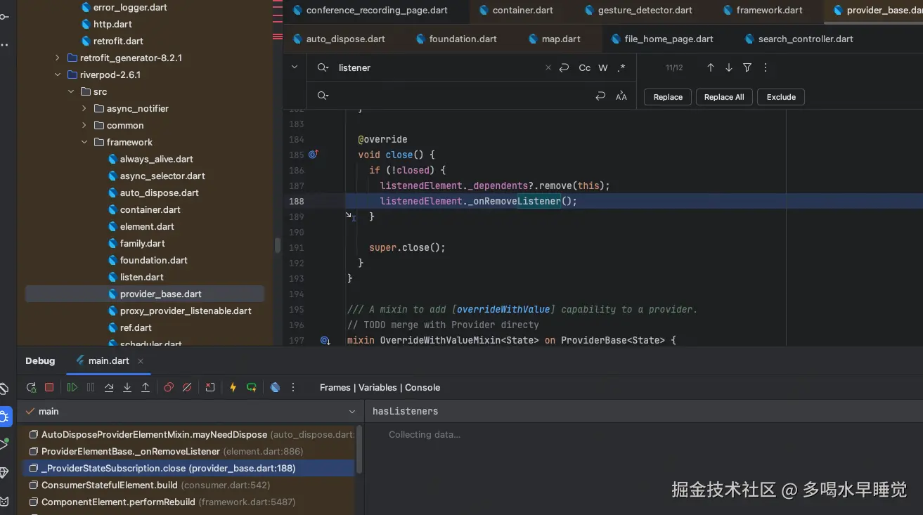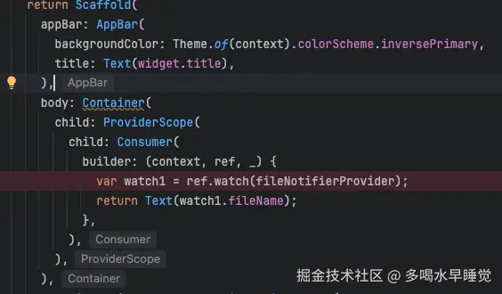 在Riverpod里面,ProviderScope是一个产生ProviderContainer的组件,ProviderContainer是用于管理provider和状态的容器,provider本身是不管理状态的。这种管理的方式是一种中心化的管理思想,因此可以在ProviderContainer里面去获取到所有provider和与之对应的状态。