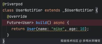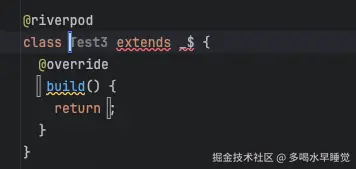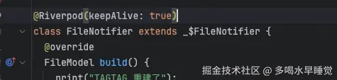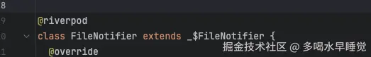 现在的riverpod推荐使用注解生成代码的形式,免去了一些provider代码的流程。使用Riverpod一般来说需要自己写一个Notiier类,用于管理state创建以及state更新逻辑;还需要写一个state类,这个state类通常用freezed注解去生成,主要是生成了json格式化的代码和copyWith代码,用于快速新生成一个State对象。