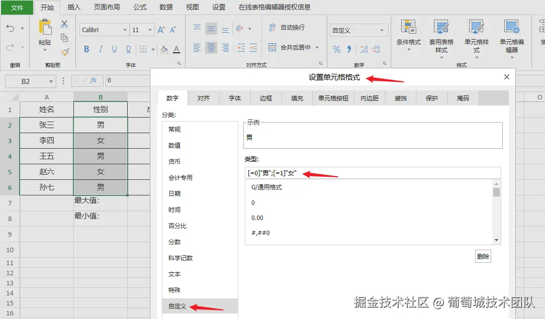 选择"性别"列单元格,打开单元格格式弹窗,在自定义中输入:[=0]"男";[=1]"女"。 [] 内为判断条件,随后的字符串为格式化后的文本,注意分号应为英文。即单元格value为0时,则显示文本为"男",value为1时,单元格显示文本为"女"。