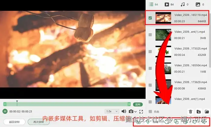 第3步:录制结束后,无需手动查找文件,软件会自动弹出视频预览窗口,方便你即时核对录制效果。在预览窗口中,还能进行基础的剪辑操作:比如将时长较长的视频按逻辑分段,删除录制过程中的冗余片段;也能添加简单的辅助元素,让视频内容更清晰易懂。