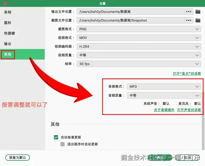 第2步:选定 “视频录制” 模式后,就进入了个性化定制环节。首先是屏幕区域选择,你可以用鼠标拖拽的方式,精准圈定需要录制的范围,也能直接选择整个电脑桌面。接着设置音频来源,若只需收录Mac录屏幕内声音(如视频背景音、软件弹窗提示音),就勾选 “系统音频” ;若需要同时记录麦克风人声,则同时勾选 “麦克风音频” 。我们还可以点击 “设置” 对音频的质量进行设置。等所有设置确认无误后,点击界面中的 “录制” 按钮,屏幕录制就会正式启动了。