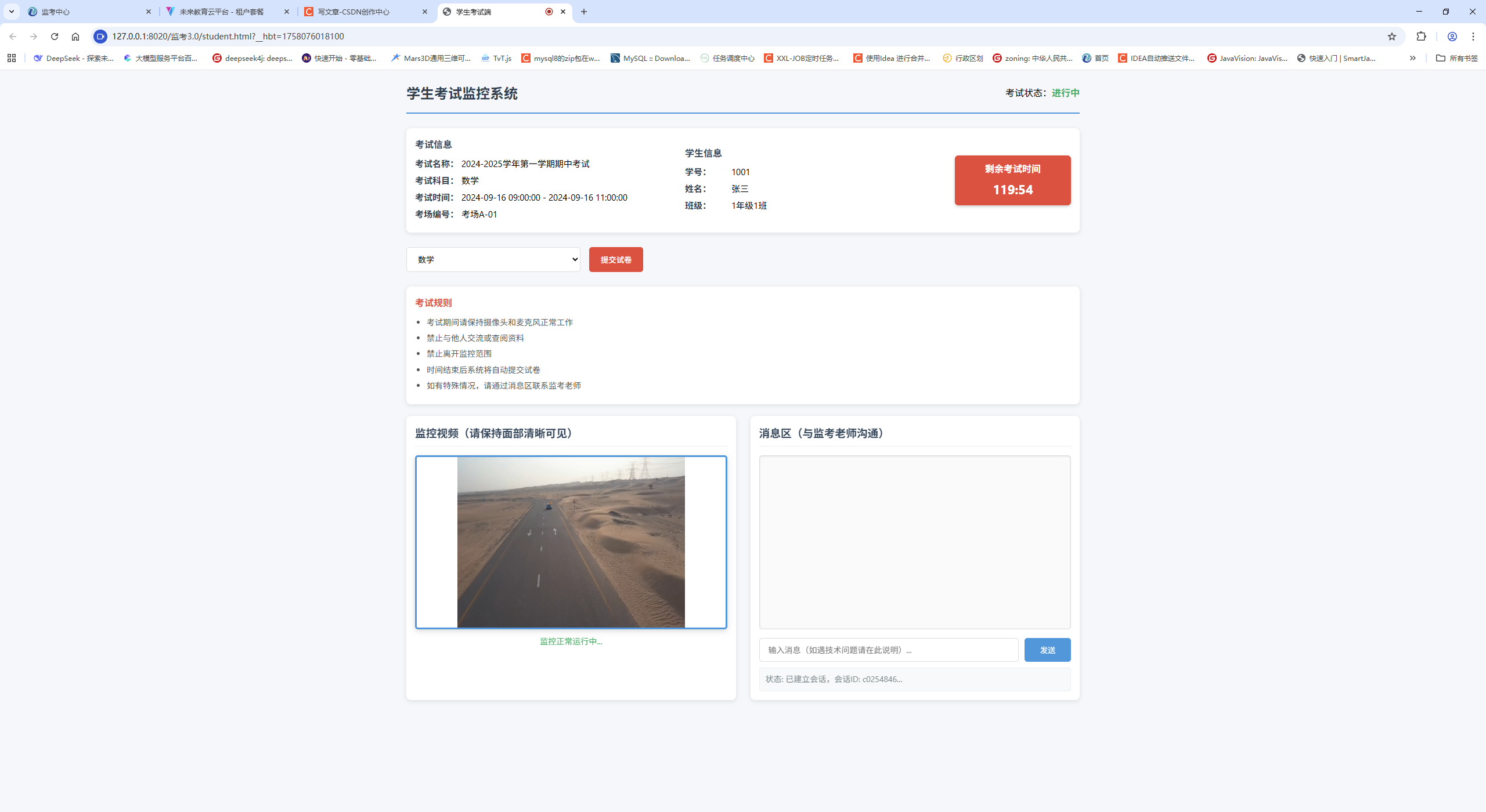 在远程考试场景中,实时监控和双向通信是确保考试公平性的核心需求。本文将分享一个基于 WebRTC 和 WebSocket 技术的在线监考系统实现方案,包含前端学生端、监考端及后端服务代码,实现了视频监控、实时消息、作弊标记等核心功能。基本无任何延迟,经过改造以及二次开发后可做视频会议等应用。