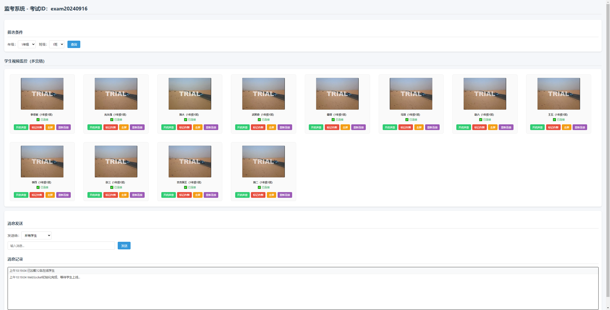 监考端支持多宫格显示,可对单个视频进行全屏、声音控制和重新连接操作