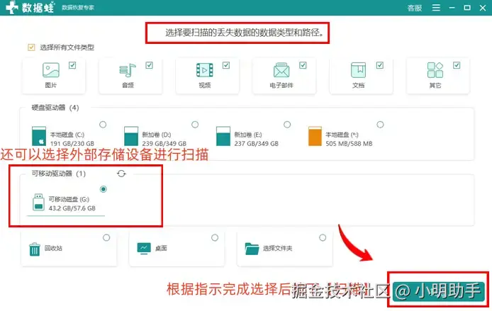 - 用户友好的操作界面: 该软件的风格为清新简约, 整个软件围绕着数据恢复的主要功能展开,在扫描设置中可供用户选择恢复文件类型和扫描位置,之后选择文件进行恢复,步骤流程简单;
