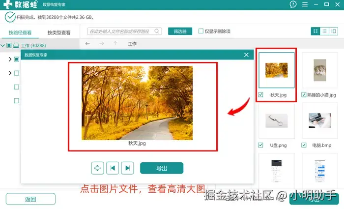 - 贴心的文件预览功能: 在文件恢复导出之前,我们就能在软件中查看文件的基本信息,图片文件还能查看缩略图,确认好后再进行恢复。
