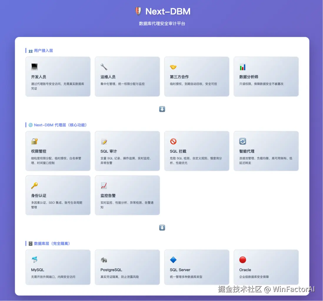 它是一款专业的数据库代理与权限管理系统,专门为解决企业数据库安全与访问控制问题而设计。