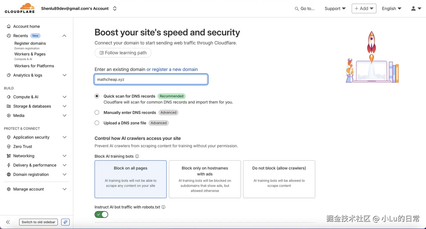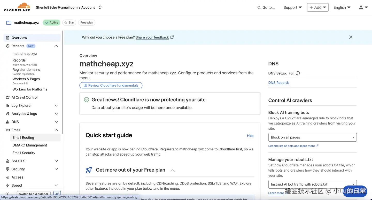 使用 Cloudflare 的前提是您需要一个域名。这里我使用的域名是mathcheap.xyz。拥有域名后,接下来就是将其托管到 Cloudflare 上。