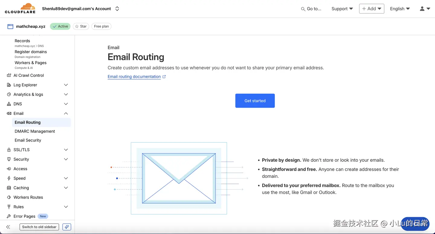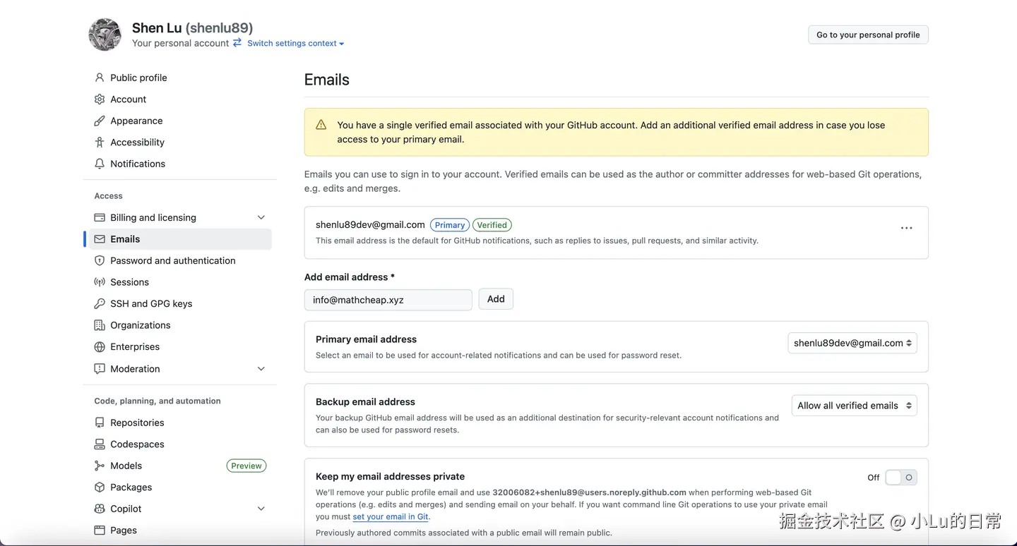 GitHub 建议至少提供两个验证邮箱。于是,打算借这个机会使用 Cloudflare 给 Mathcheap 配置一个企业邮箱,用来作为 GitHub 账号的第二个验证邮箱。