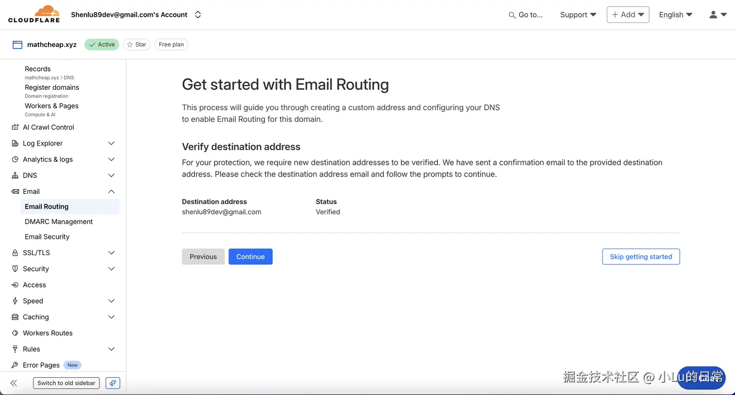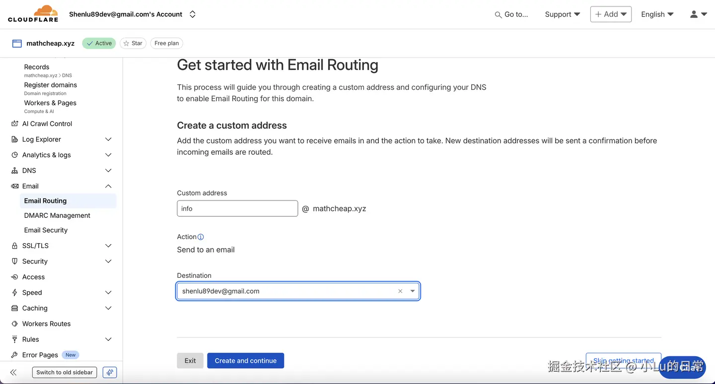 点击”Continue“,设置邮箱(mathcheap.xyz)和邮件接收邮箱(shenlu89dev@gmail.com):