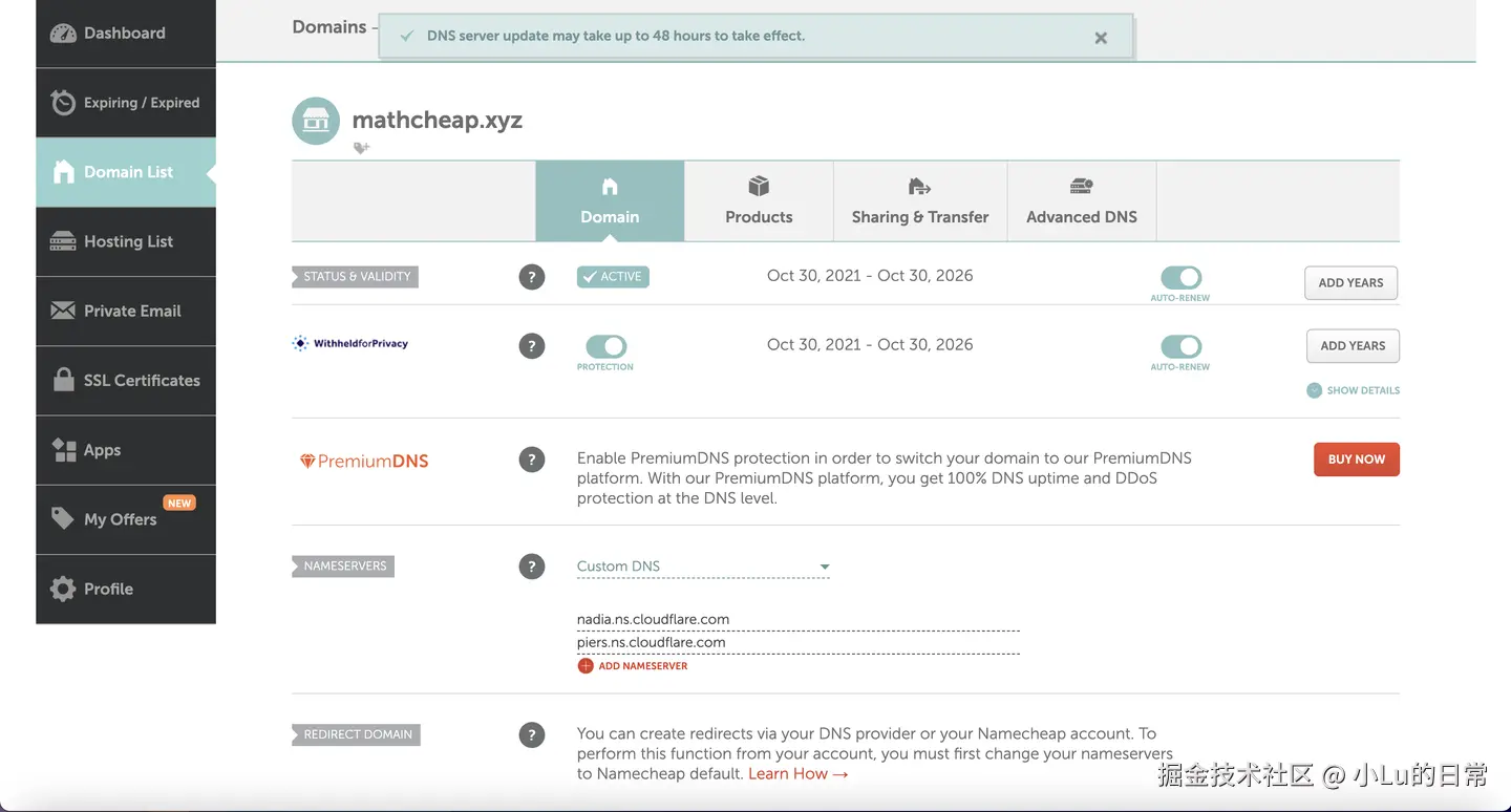 登录购买域名网站(例如:Namecheap)的域名管理后台。