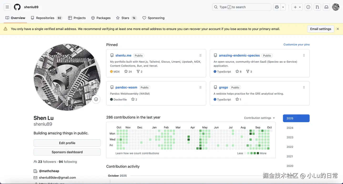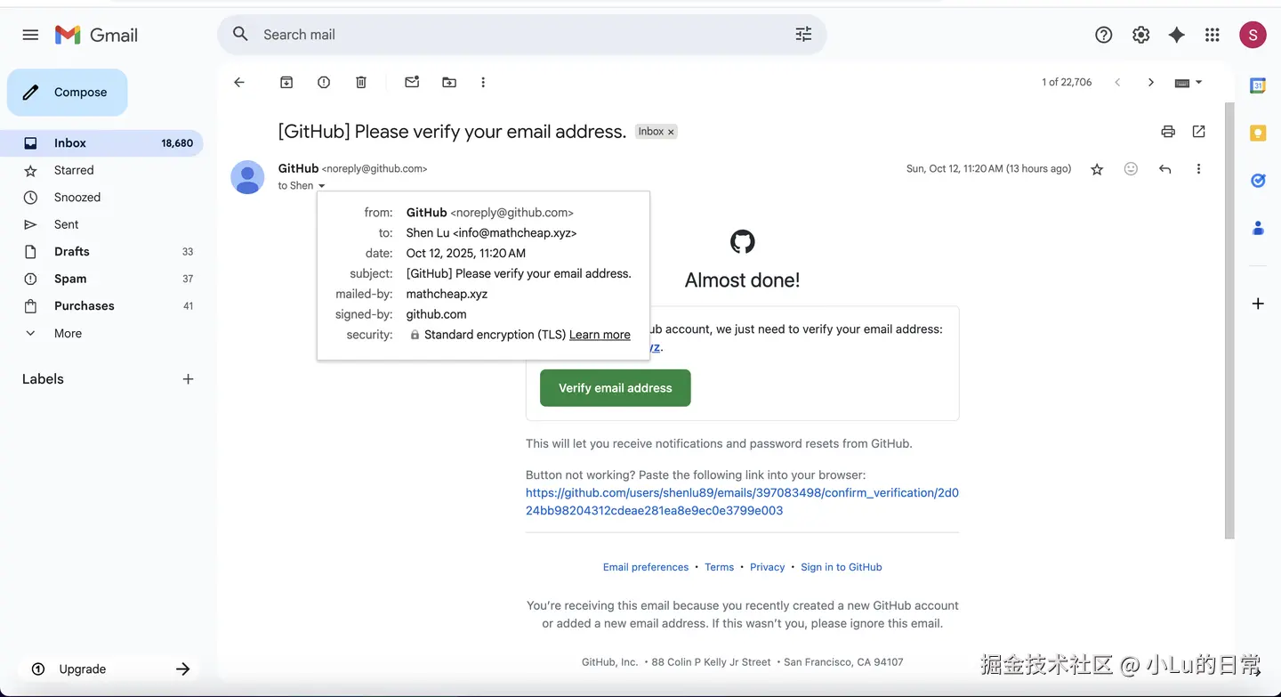 至此,shenlu89dev@gmail.com可以正常的接收info@mathcheap.xyz 发送过来的邮件,同时也完成了 GitHub 备用邮箱的设置。