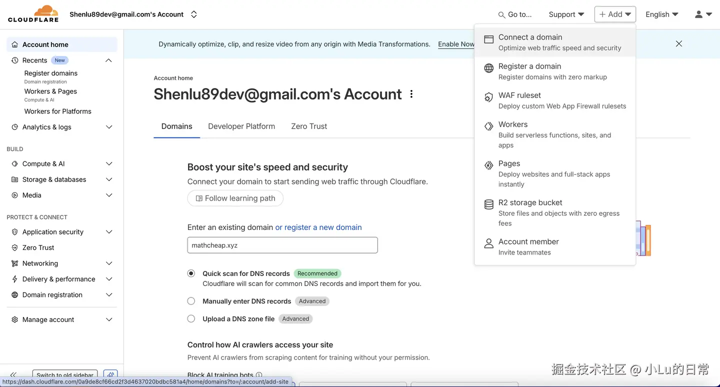 登录后,在 Cloudflare 仪表板右上角点击 "Connect a domain",输入域名(例如:mathcheap.xyz),然后点击“Countine”