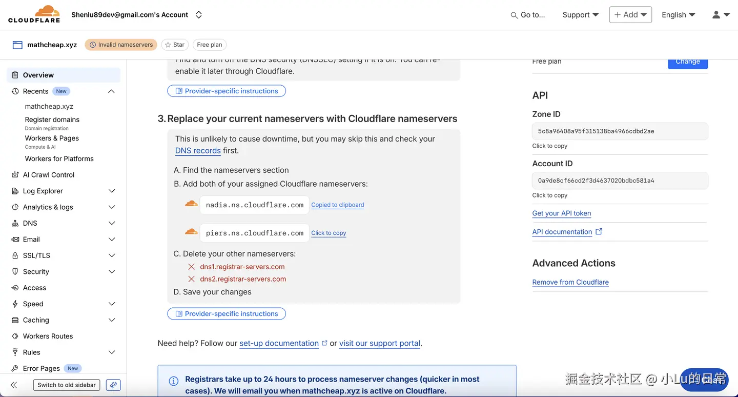 第一步:准备一个域名并托管到 Cloudflare