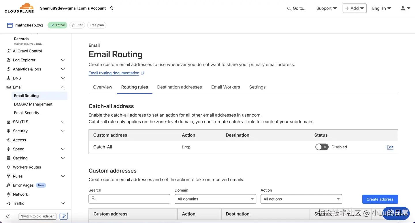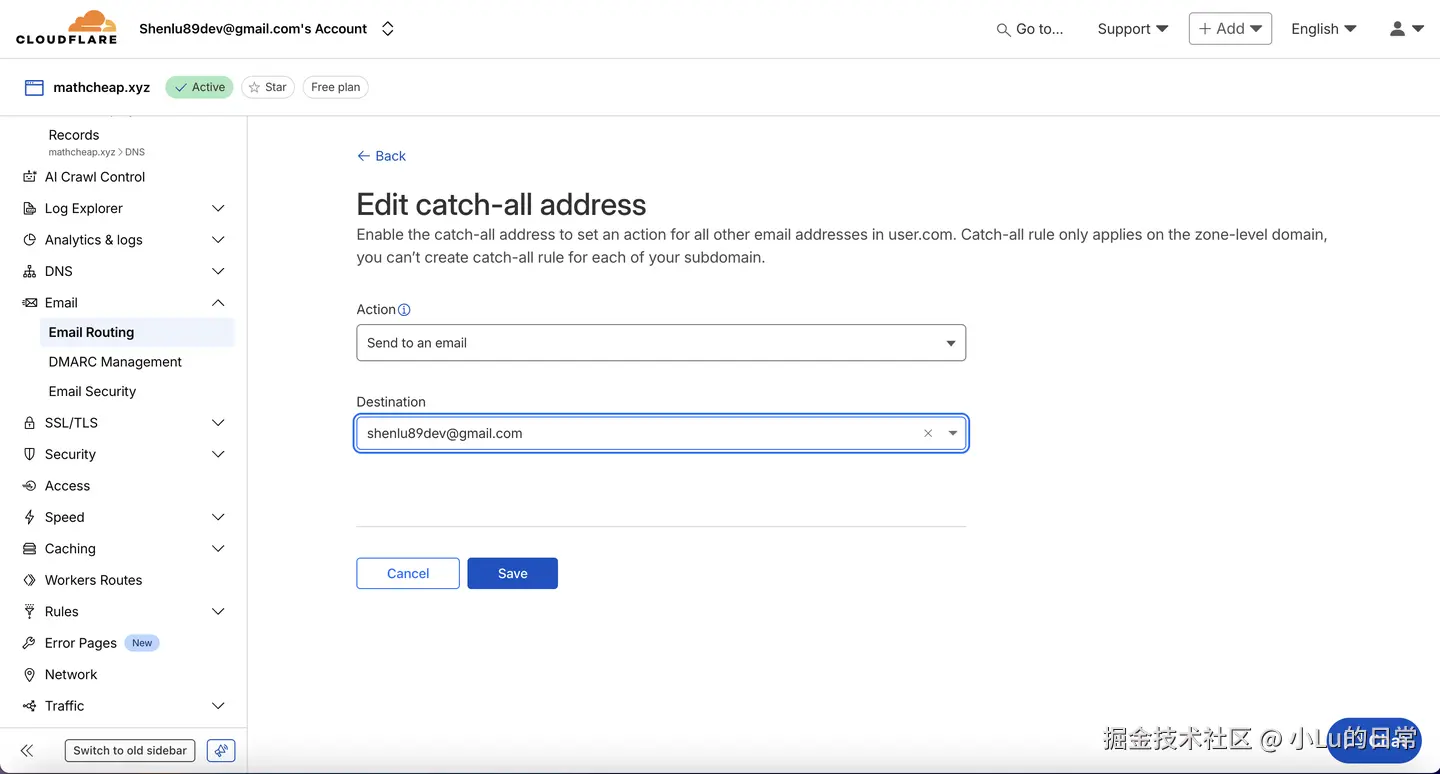 验证完成后,回到 Cloudflare 的电子邮件路由页面,刷新一下。在 Catch-all 地址旁边会有一个开关,将其打开(显示为绿色)。