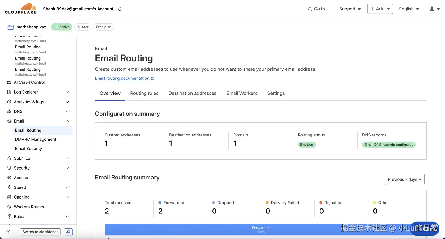 至此,我已经成功配置了一个 Mathcheap 的企业级邮箱的接收功能。任何发送到 info@mathcheap.xyz 的邮件,都会自动转发到我的shenlu89dev@gmail.com中。