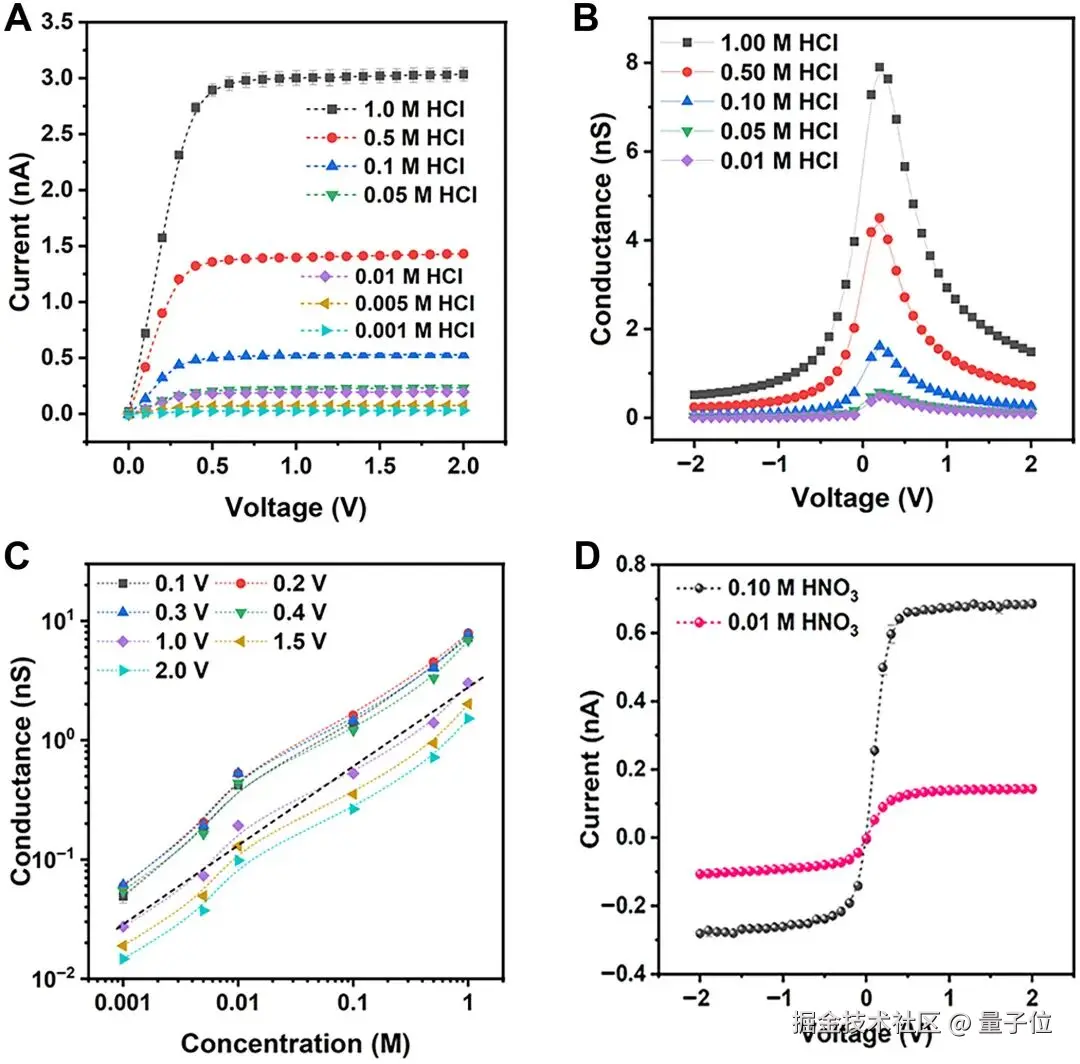 然后研究人员将 h-MOFNT 放置在不同电压偏置下的 0.1 M 氯化物金属离子溶液中进行电流 - 电压 (I–V) 测试,观察离子_(尤其是质子)_在该器件中的传输特性。