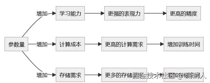 - 计算成本:随着参数量的增加,模型的计算需求也会增加,意味着需要更多的计算资源和训练时间。