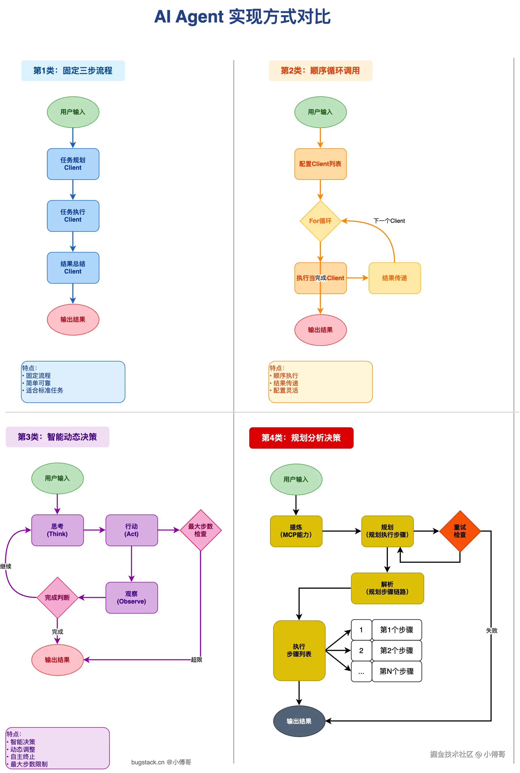在整个 Ai Agent 的实现中,小傅哥带着大家分析设计了4种方案,包括;固定执行的、循环执行的、智能分析决策的还有一个按照步骤规划的。这些流程都有适合于自己业务场景使用。在代码中也都有不同方案的实现,之后通过用户选择后进行动态化的策略调度。