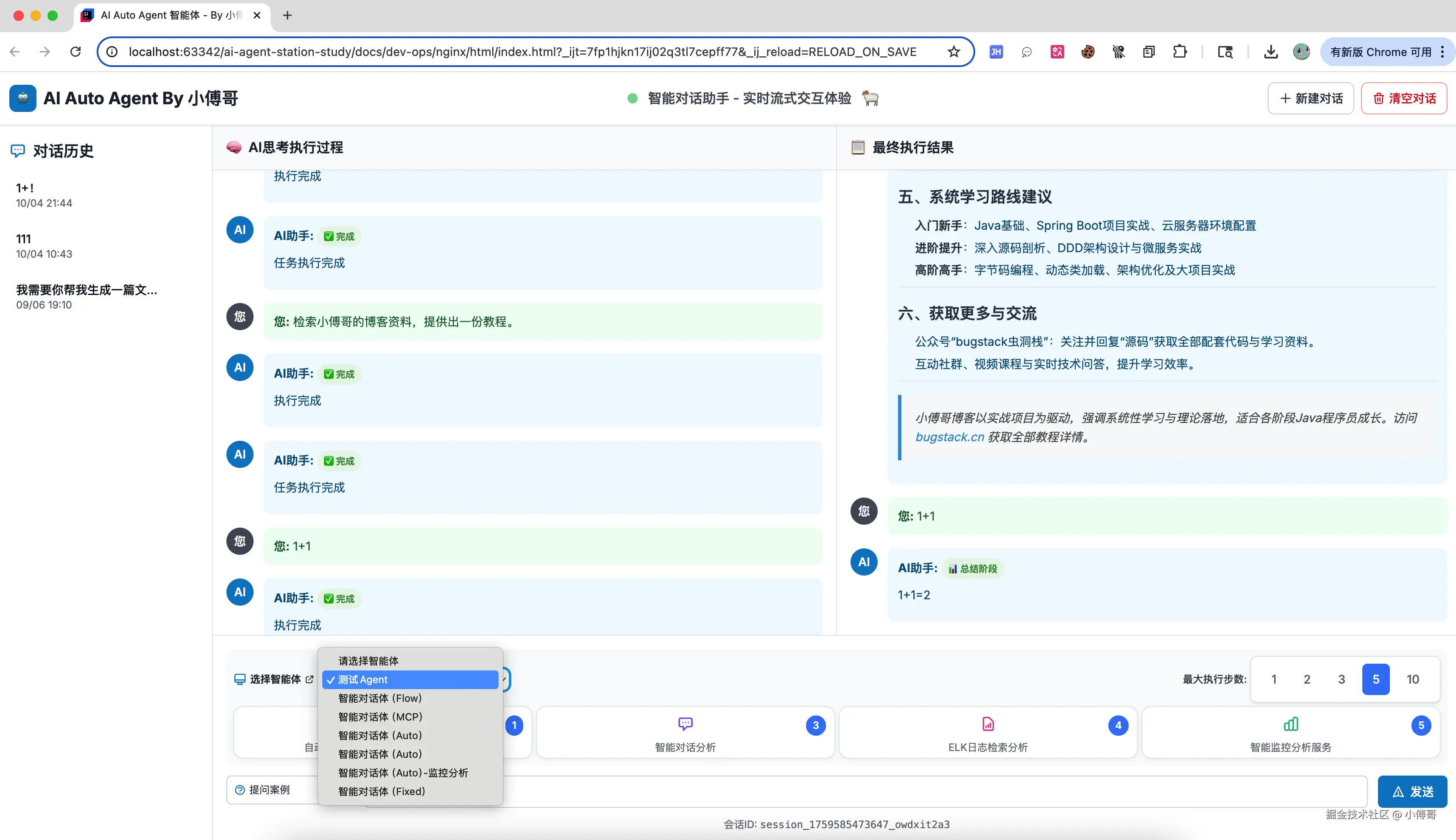 - 掌握一套可视化链路编排运用能力,通过前端页面的拖拉拽操作,完成 AI Agent 智能体的动态配置、加载和使用(非常丝滑)。