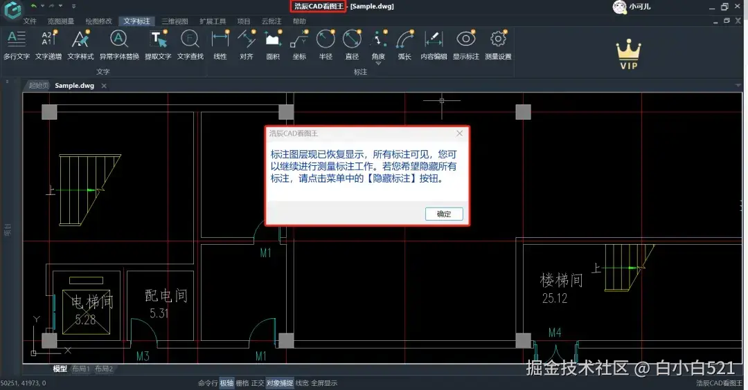 当我们的标注被隐藏后,有时候我们会忘记曾经标注过,这时候可能会选择再次标注,为了避免重复工作浪费时间,在浩辰CAD看图王新版本中,为了方便大家查看标注以及进行接下来的标注,当之前的标注被隐藏后,再次点击标注的时候会有弹窗提示,如下图所示。