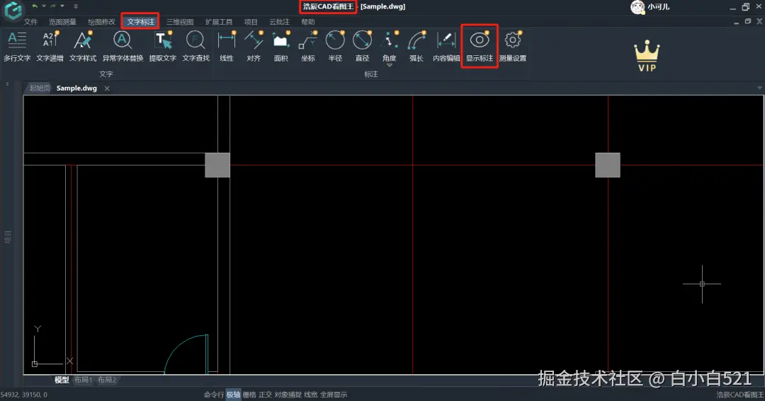 不管我们是出于误操作将标注进行了隐藏还是说有意为之,当我们想再次查看标注的时候,也是很方便的,只需要在浩辰CAD看图王【文字标注】菜单栏下点击【显示标注】菜单按钮即可。